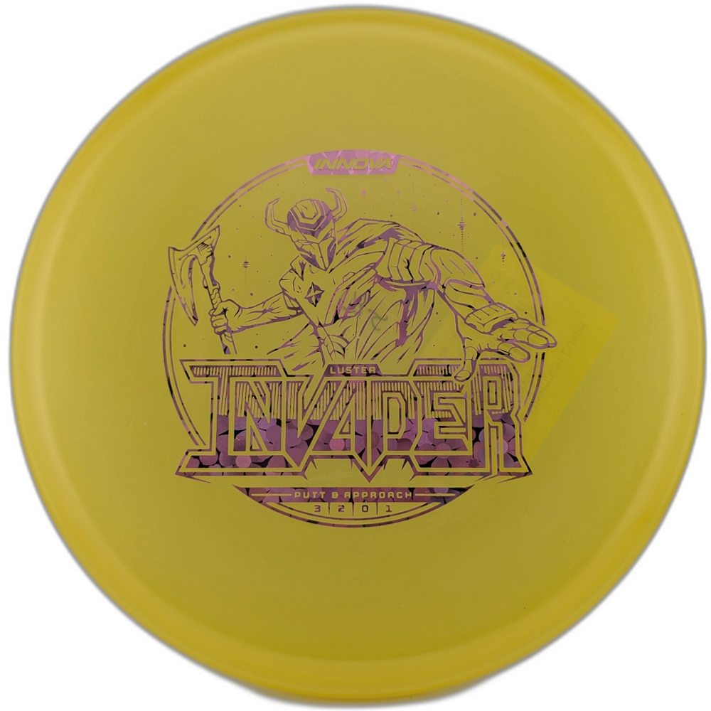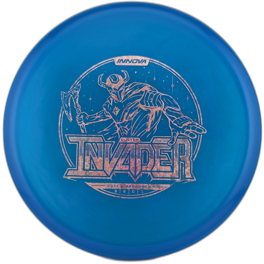 The new Luster Invader from Innova is one of the best new driving putters there is. It is a disc that can be crushed and it will handle your power while still flying really straight. At lower speeds it will be a disc that pushes forward and flies straight with a nice little fade at the end. It has a small bead that really feels nice in the hand. They are fairly shallow so they are easy to get a clean release on power shots. The Luster plastic feels really good and has a nice grip to it. This run is not the stiffest run of Luster but it is a plastic that has a long life cycle. If you are looking for a straight driving putter that can handle some torque, then try out a Luster Invader.
